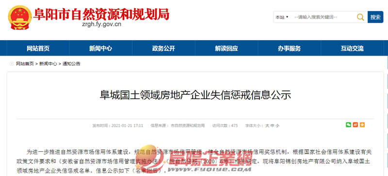 1月21日,阜陽市自然資源和規(guī)劃局公布《阜城國土領(lǐng)域房地產(chǎn)企業(yè)失信懲戒信息公示》。公示顯示,因拖欠土地使用權(quán)出讓金,阜陽錦創(chuàng)房地產(chǎn)有限公司被納入阜城國土領(lǐng)域房地產(chǎn)企業(yè)失信懲戒名單,在足額繳納土地使用權(quán)出讓金以及違約金前,自然資源和規(guī)劃部門暫不受理其新的建設(shè)用地申請(qǐng)。 詳情如下: 為進(jìn)一步推進(jìn)自然資源市場信用體系建設(shè),規(guī)范自然資源市場信用管理,健全自然資源市場信用獎(jiǎng)懲機(jī)制,根據(jù)國家社會(huì)信用體系建設(shè)有關(guān)政策文件要求和《安徽省自然資源市場信用管理實(shí)施辦法》(皖自然資規(guī)〔2020〕6號(hào))相關(guān)規(guī)定,現(xiàn)將阜陽錦創(chuàng)房地產(chǎn)有限公司納入阜城國土領(lǐng)域房地產(chǎn)企業(yè)失信懲戒名單。信息公示如下(名單附后)。 此前,1月20日,因存在未批先建的違法行為,阜陽錦創(chuàng)房地產(chǎn)有限公司的“禧悅江山”項(xiàng)目被阜陽市自然資源和規(guī)劃局公示。 具體如下: 阜陽錦創(chuàng)房地產(chǎn)有限公司的“禧悅江山”項(xiàng)目位于阜陽市潁東區(qū)東湖路北側(cè)、東平路西側(cè)。我局在對(duì)項(xiàng)目現(xiàn)場查勘時(shí)發(fā)現(xiàn)該項(xiàng)目1#住宅樓、2#住宅樓、3#住宅樓、5#住宅樓存在未批先建的違法行為,經(jīng)復(fù)核1#住宅樓、2#住宅樓、3#住宅樓、5#住宅樓現(xiàn)狀位置與規(guī)劃總平面圖基本一致。根據(jù)《關(guān)于城鄉(xiāng)規(guī)劃公開公示的規(guī)定》,現(xiàn)將該處違法建設(shè)進(jìn)行公示。 公示期從2021年1月20日至2021年1月28日?!办麗偨健表?xiàng)目周邊群眾及單位如對(duì)本次公示內(nèi)容有異議,請(qǐng)?jiān)诠酒趦?nèi)將書面意見送達(dá)我局,逾期視為同意。公示期滿后,我局將依據(jù)《安徽省城鄉(xiāng)規(guī)劃條例》規(guī)定,對(duì)該公司“禧悅江山”項(xiàng)目違法建設(shè)性質(zhì)進(jìn)行認(rèn)定,并抄告市城市管理行政執(zhí)法局對(duì)該項(xiàng)目進(jìn)行處罰。待市城市管理行政執(zhí)法局處理結(jié)束后,辦理相關(guān)規(guī)劃手續(xù)。如因版面有限無法看清,可到項(xiàng)目現(xiàn)場及三處公示欄(市城市規(guī)劃展示館、清河廣場、東三角公園)或我局查詢。 來源:阜陽市自然資源和規(guī)劃局 |